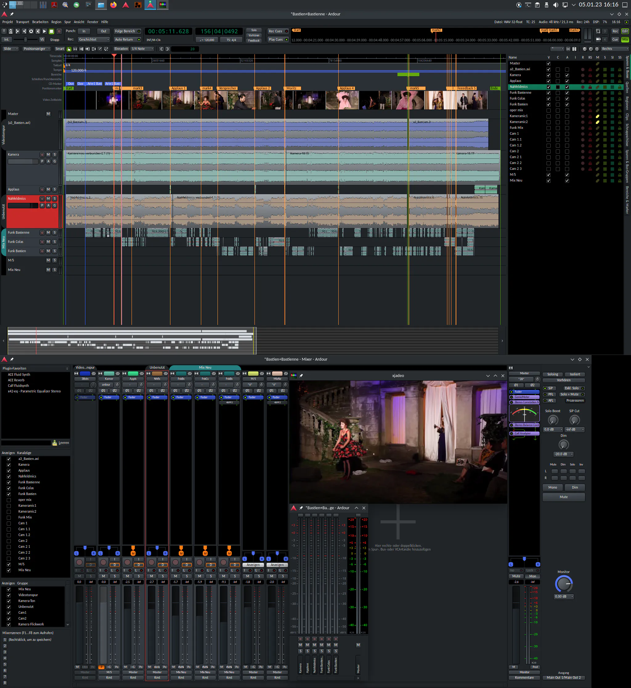 - Drie machines: een aparte videoserver (voor het decoderen van de tijdlijn en het archiveren van bestanden), een aparte videomonitor en Ardour.