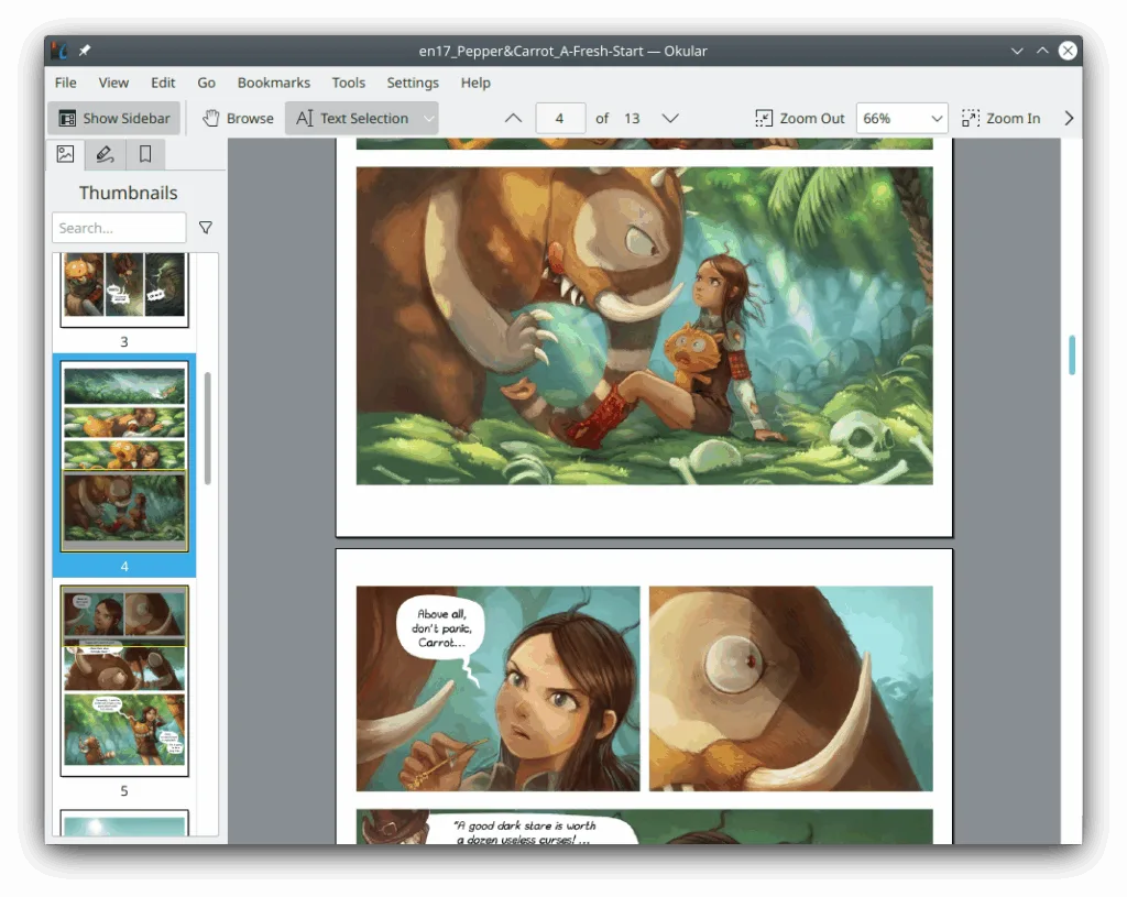 Multi-platform, snel en volgepakt met functies, Okular biedt u het lezen van PDF documenten, strip- en EPub-boeken, bladeren in afbeeldingen, visualiseren van Markdown documenten en veel meer.