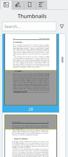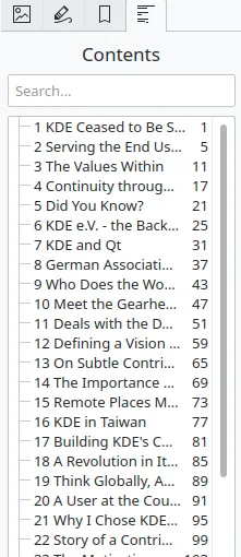 In uw inhoud navigeren is gemakkelijker dan ooit. Met het miniaturenpaneel van Okular kunt u grafisch in het deel van het document waarnaar u zocht bladeren. Met het ‘Paneel inhoud’, vindt u het hoofdstuk dat u nodig hebt in alle ondersteunde documenten.